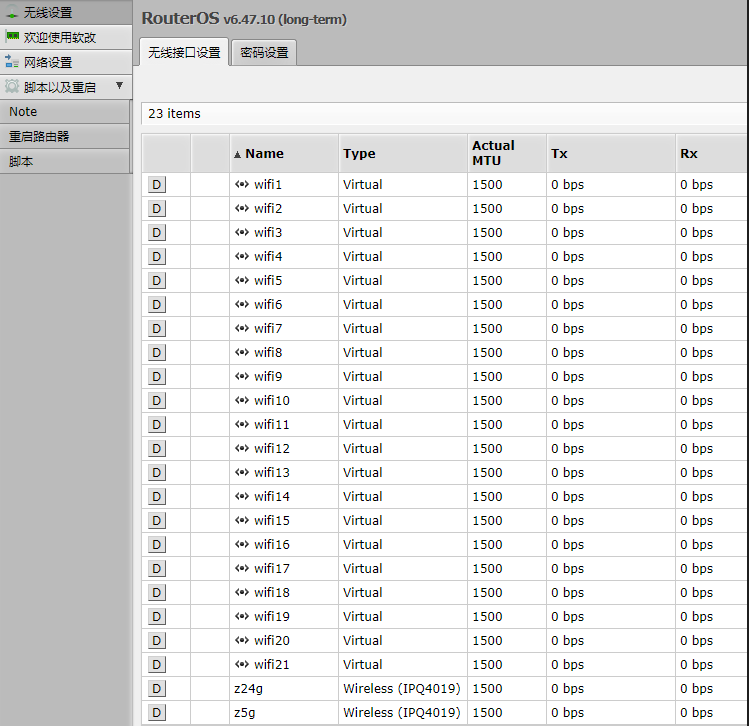 三,因为我们的是1拖20的路由器,有20个无线WIFI信号,点“无线配置”如图所示,z24g与z5g这2个是路由器的主wifi,严禁关闭。另外20个就是发射出来的虚拟wifi的,这20个虚拟WIFI需要设置购买的ip之后才能正常使用。