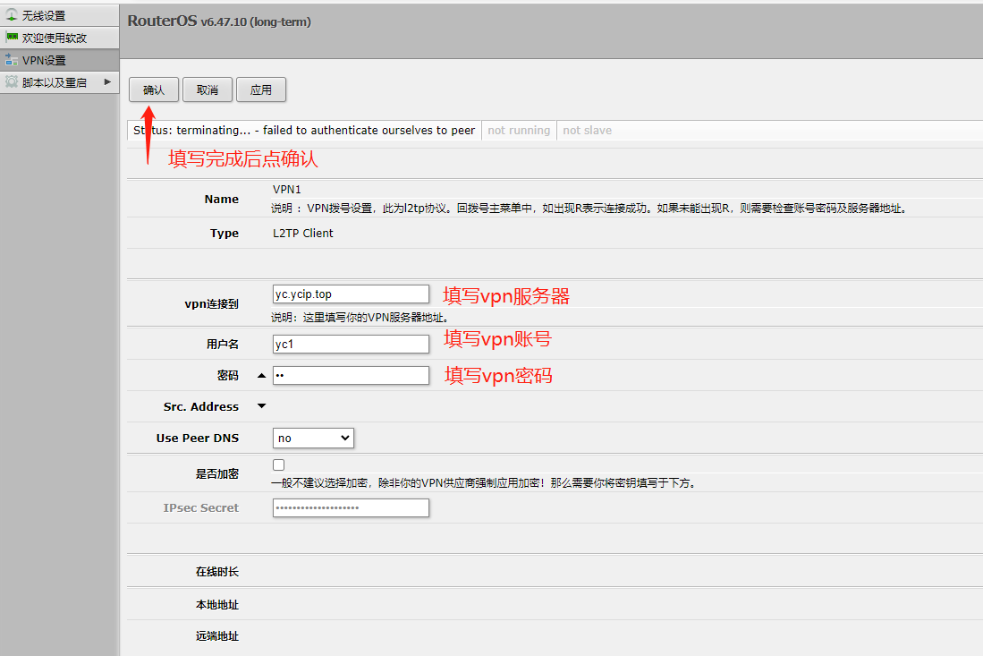 点“VPN设置”,点一下“vpn1”,就会出来设置界面,如图填写: